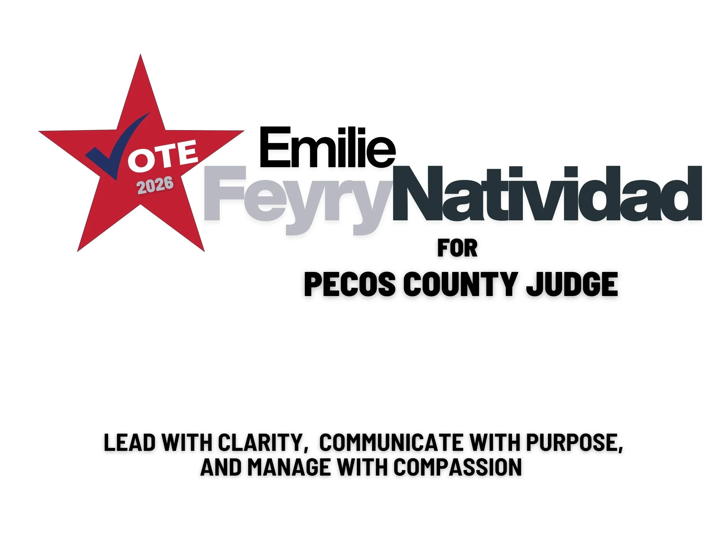 “As a passionate community advocate, I, Emilie Feyry-Natividad am running for Pecos County Judge. I’ve spent years on the ground working with many of you at local events and through community organizations. What I've learned is that an effective leader is not just present but also dedicated to those principles that matter the most. My unwavering stance has demonstrated my commitment to transparency and courage to uphold the law, and to educate our community for the future. I have consistently held a strong position willing to shine light to ensure public trust is upheld. I believe that true progress comes from growing from our mistakes. I will always put our voters first, with integrity and ensure that our government policies work for the people it serves and I, as Pecos County’s’ public servant, and God’s.”